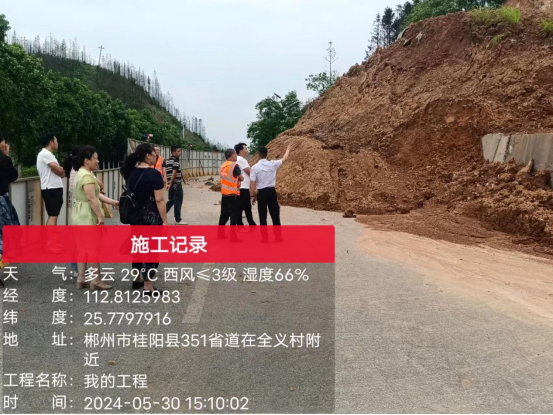 桂阳县正和镇人大代表们在X090线全义路段查看山体滑坡及路面破损情况,并认真听取了附近村民的意见建议。